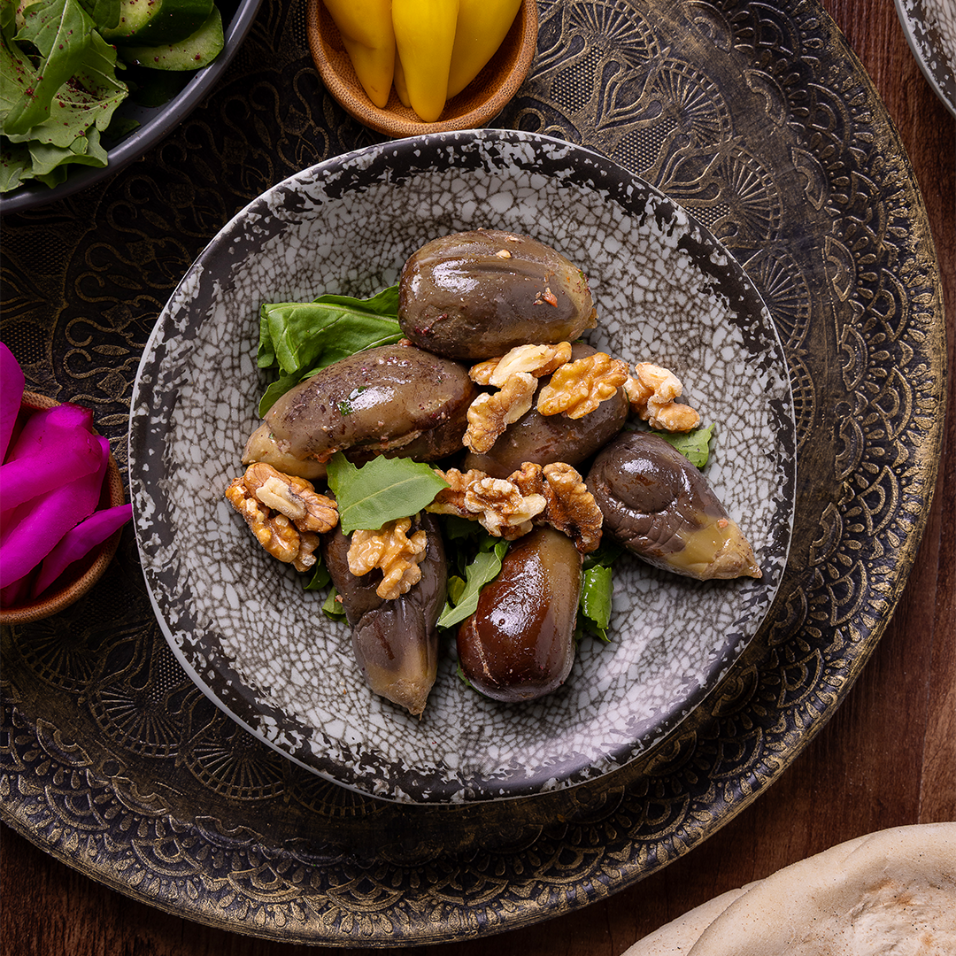 حبات باذنجان صغيرة مكدوسة ومحشوة بمزيج غني من الجوز (عين الجمل) والفلفل الأحمر والثوم، مغمورة بزيت الزيتون الصافي. طبق تراثي يمتاز بنكهته الحمضية والقوية، يعتبر رفيقاً مثالياً لمائدة الفطور الشامية.